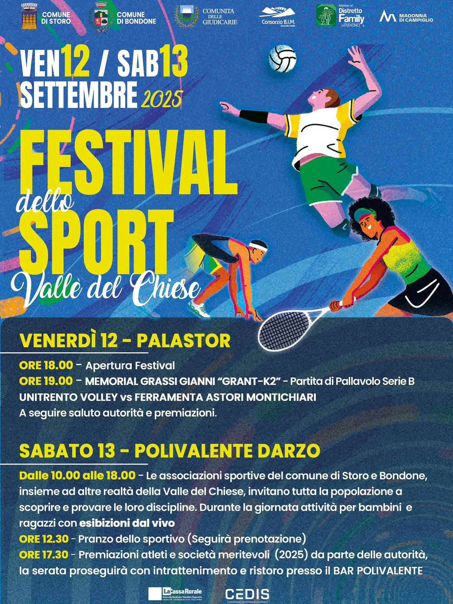 Si parte venerdì sera al Palastor di Storo, con l’apertura ufficiale del Festival e una grande sfida di pallavolo di serie B in memoria di Grassi Gianni “Grant-K2”: UNITRENTO VOLLEY contro FERRAMENTA ASTORI MONTICHIARI. Una serata di sport e amicizia, che si concluderà con le premiazioni e il saluto delle autorità.